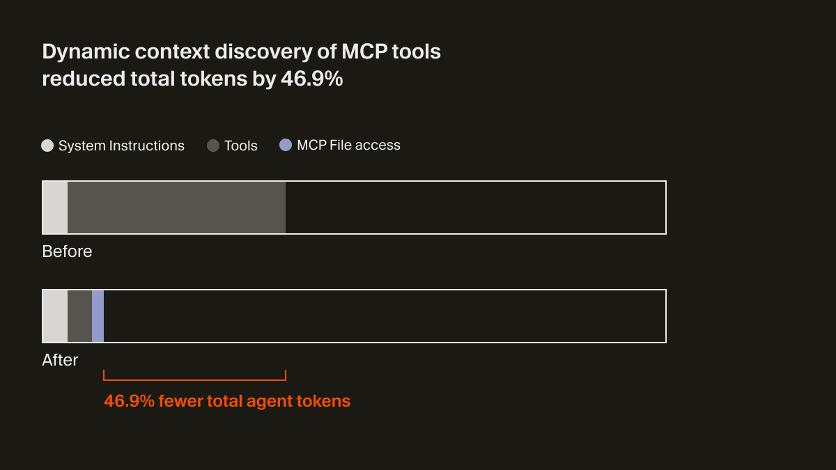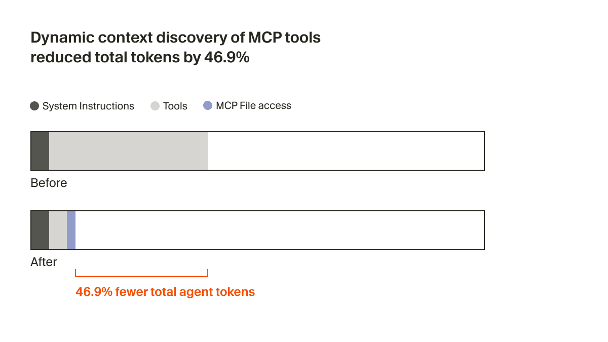 The agent now only receives a small bit of static context, including names of the tools, prompting it to look up tools when the task calls for it. In an A/B test, we found that in runs that called an MCP tool, this strategy reduced total agent tokens by 46.9% (statistically significant, with high variance based on the number of MCPs installed).