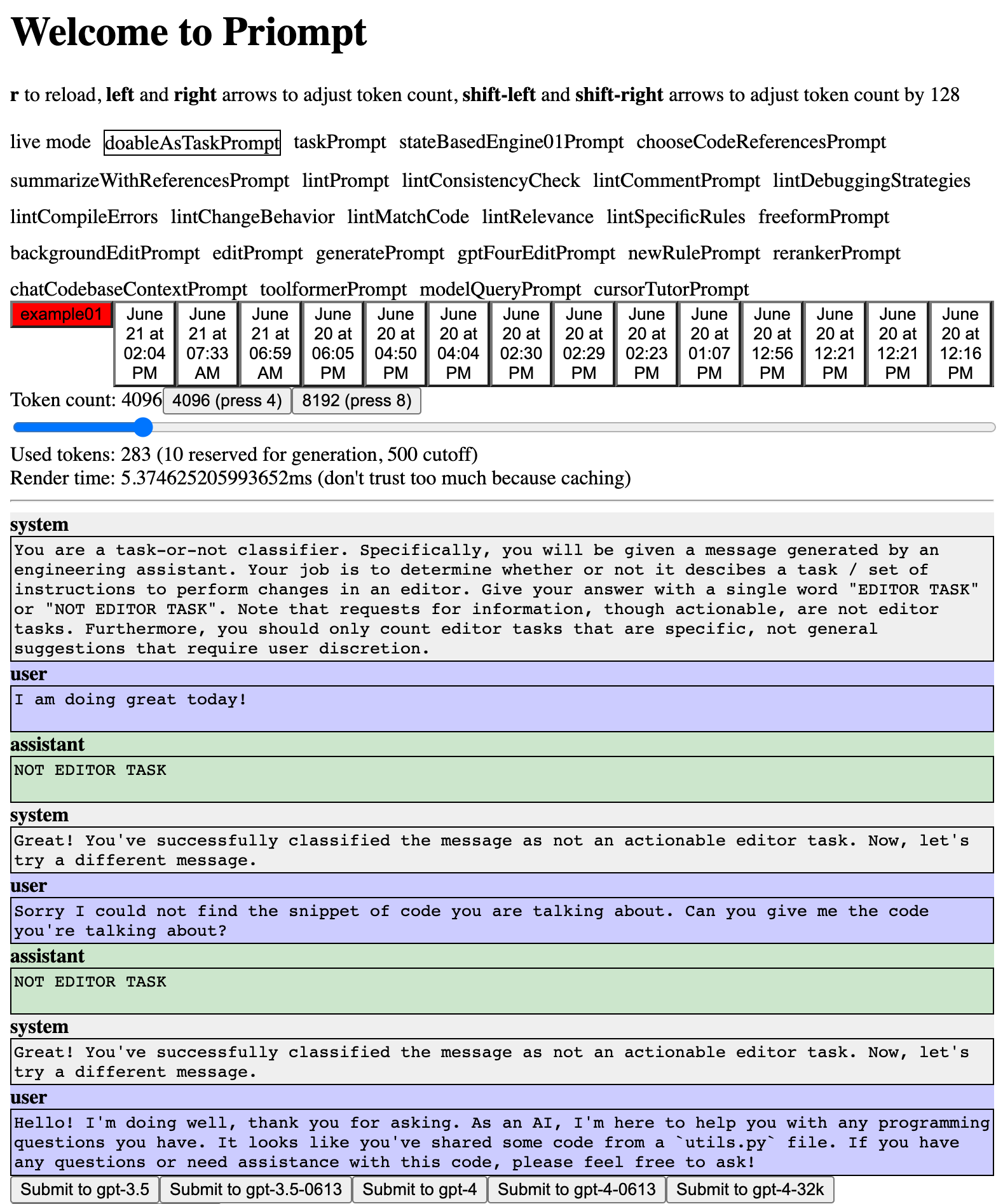 Priompt also comes with a (very hastily put together) preview website, where you can preview your prompt on real data. When developing your application, you can log the serialized props