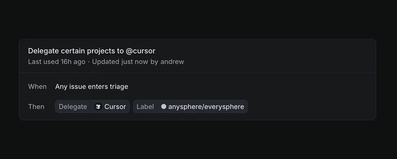 The Cursor team uses Linear to track thousands of tasks related to customer feedback, features, and bugs. We’ve created a Triage rule for all product bugs and feedback, where Cursor is automatically assigned and the issue tagged with a label for our repository.