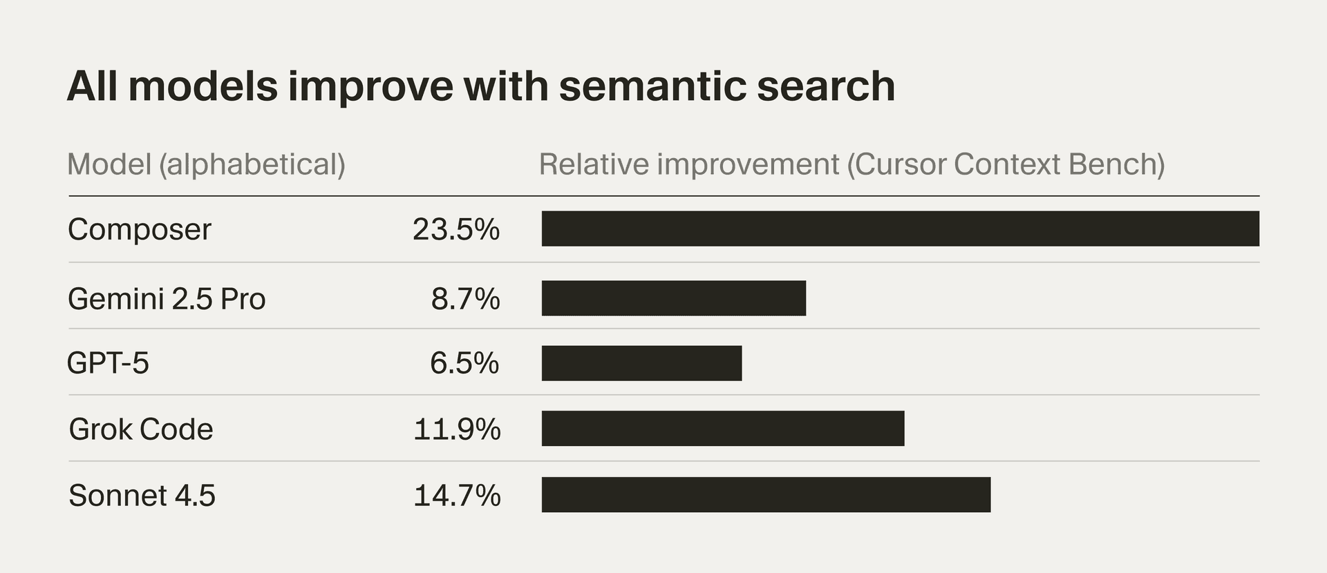 To support semantic search, we’ve trained our own embedding model and built indexing pipelines for fast retrieval. While you could rely exclusively on grep and similar command-line tools for search, we've found that semantic search significantly improves agent performance, especially over large codebases: