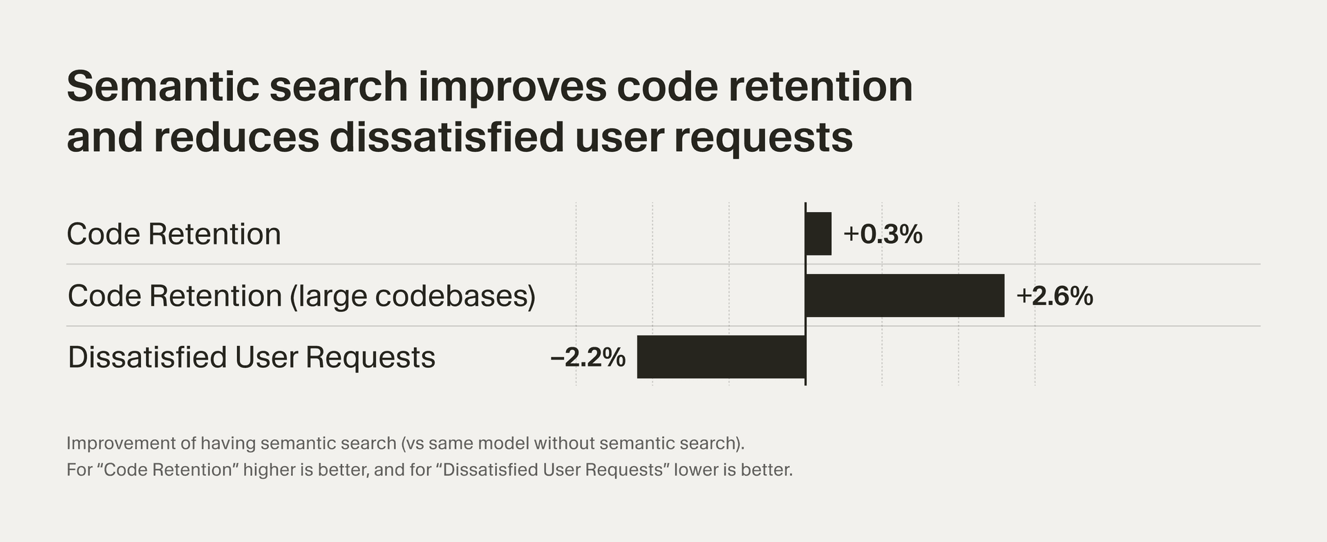 • Code Retention: Code written by effective agents is more likely to remain in user codebases. We see agent code retention increases by 0.3% when semantic search is available. This effect increases to 2.6% on large codebases with 1,000 files or more.