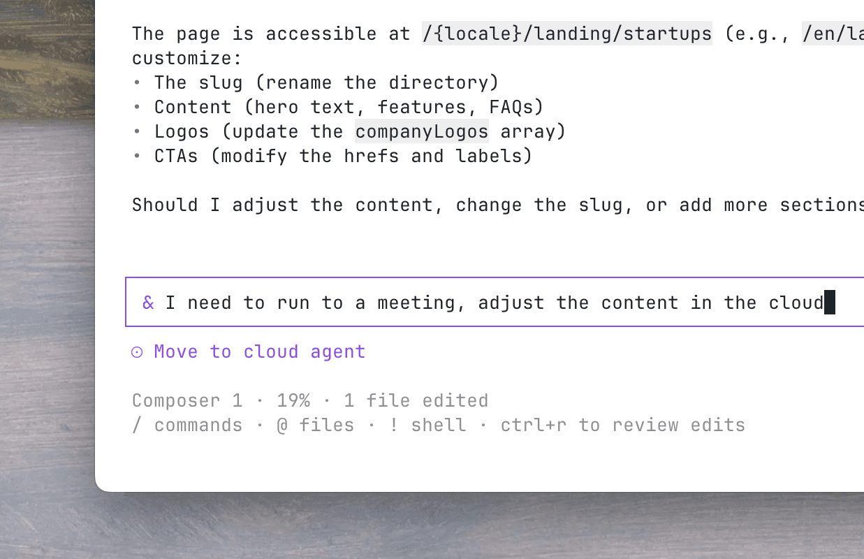 Push your local conversation to a Cloud Agent and let it keep running while you're away. Prepend & to any message to send it to the cloud, then pick it back up on web or mobile at cursor.com/agents.